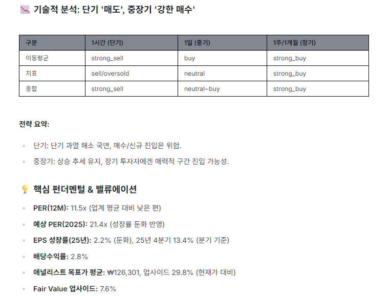 | 밸류에이션 | 현재 주가가 적정 가치 대비 저평가/고평가 여부 분석 | 매수/매도 시점 참고 | 기타 데이터 |