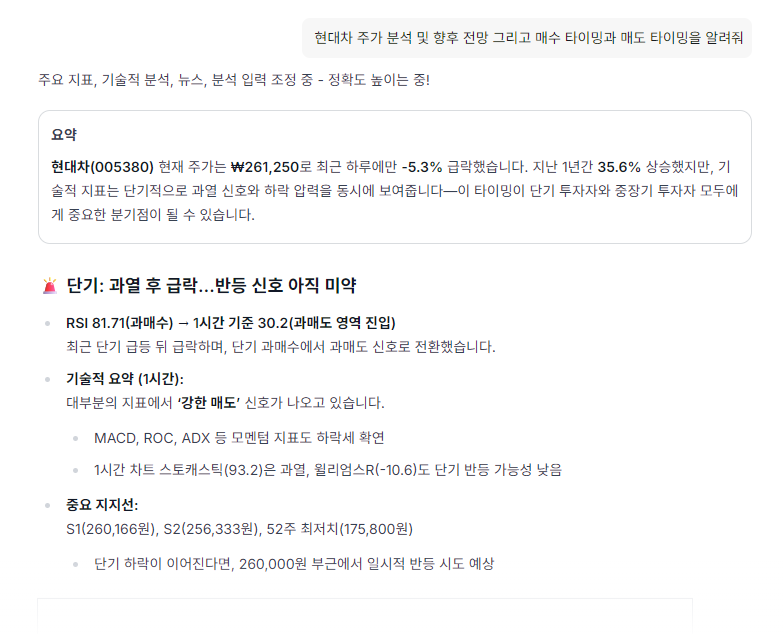 | 시장 심리/기술 | 뉴스 심리 분석, 기술적 지표(MACD, RSI 등) 분석 | 단기적인 모멘텀 판단 | 보조 지표 활용 |