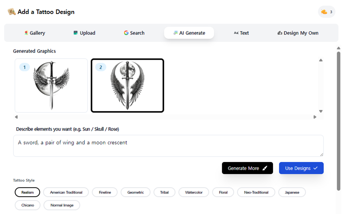 먼저, 입력창에 원하는 타투 이미지를 묘사하는 텍스트를 입력합니다. (사진과 이미지를 입력해도 됩니다.)