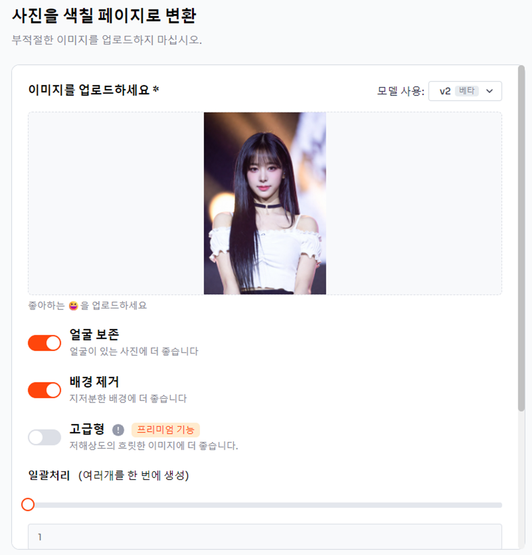 - 업로드 버튼을 눌러 변환하고 싶은 사진을 선택하세요.