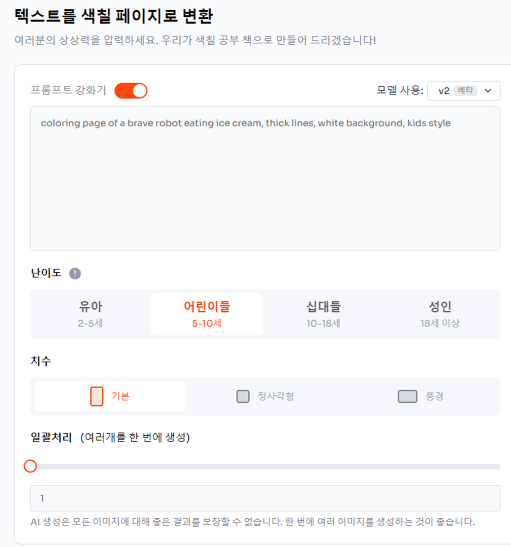 - 스타일 선택: 단순한 그림체부터 복잡한 만다라 스타일까지 선택할 수 있어요. 아이들을 위한다면 'Simple'이나 'Cartoon' 스타일을 추천해요.