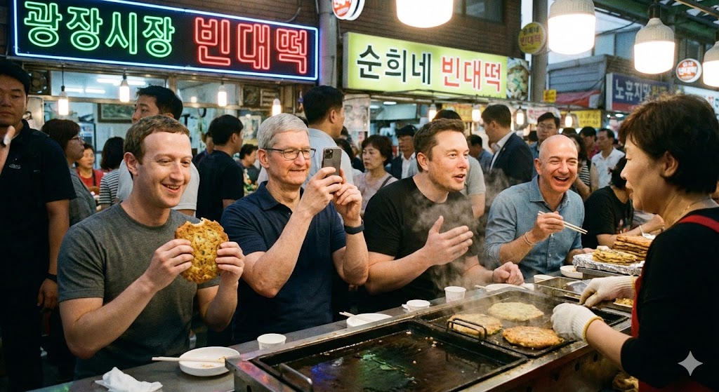 프롬프트 : 미국 빅테크 인사들이 한국 광장시장에서 빈대떡을 사먹는 모습