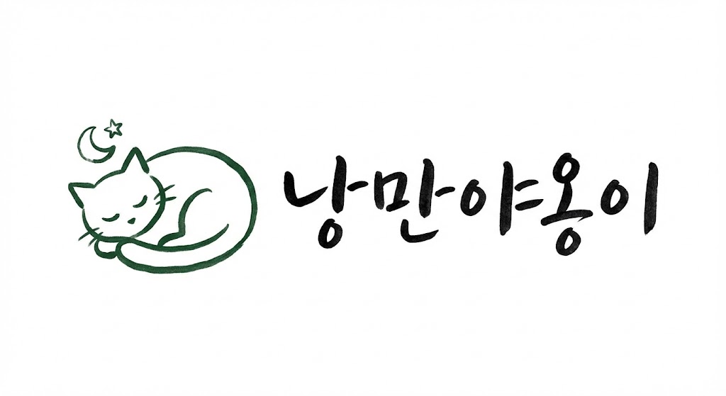 - 오른쪽에는 한국어 손글씨로 쓴 “낭만야옹이” 로고타입을 배치