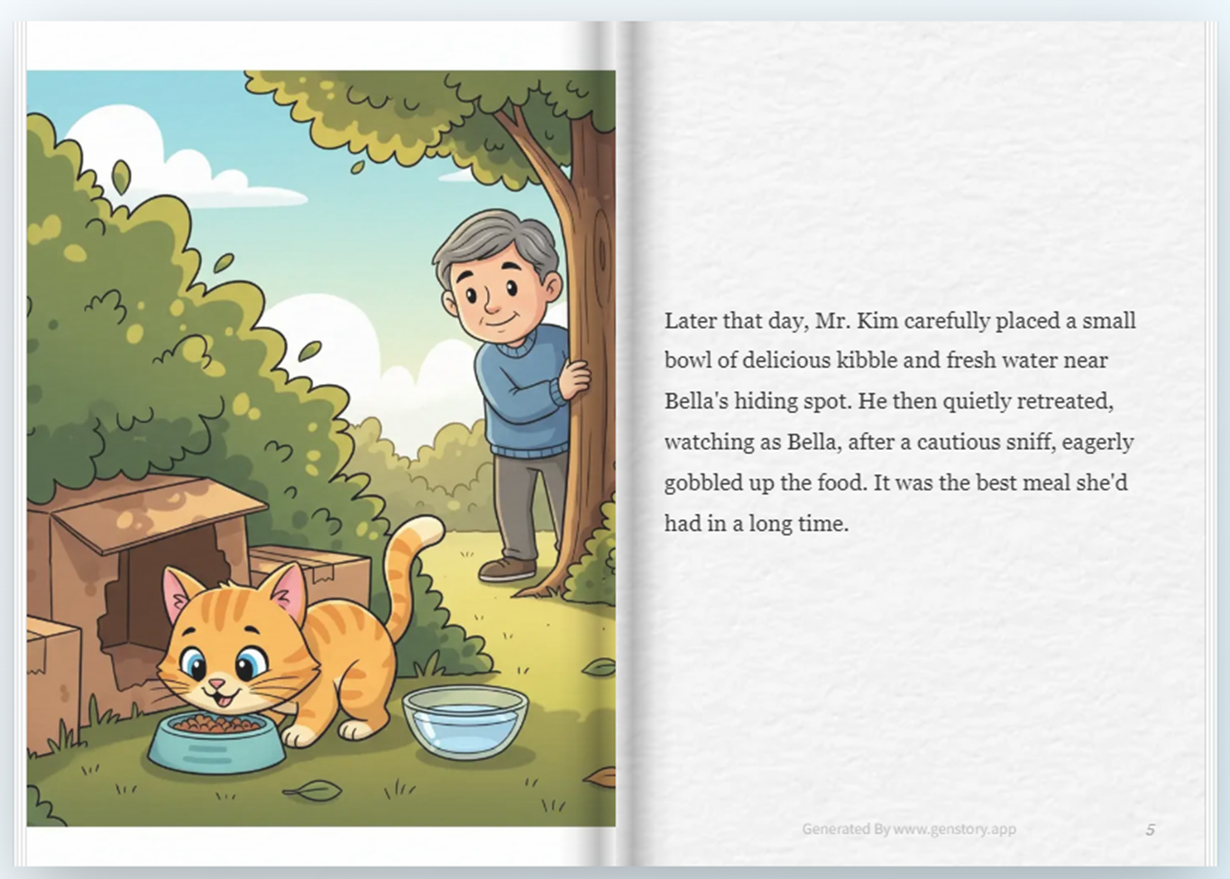 - AI 생성 및 검토: '생성하기' 버튼을 누르면 AI가 글과 그림을 만듭니다. 이후 문구 수정이나 이미지 교체도 가능해요!