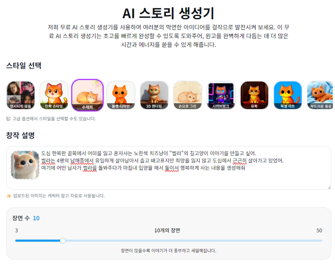 줄거리를 입력할 때 "토끼가 거북이를 이기는 이야기"처럼 너무 짧게 쓰기보다는, "자신감 넘치는 토끼와 꾸준히 노력하는 거북이가 우주에서 경주를 하는 이야기"처럼 구체적인 배경이나 반전을 넣어주면 훨씬 더 흥미진진한 결과물이 나옵니다!