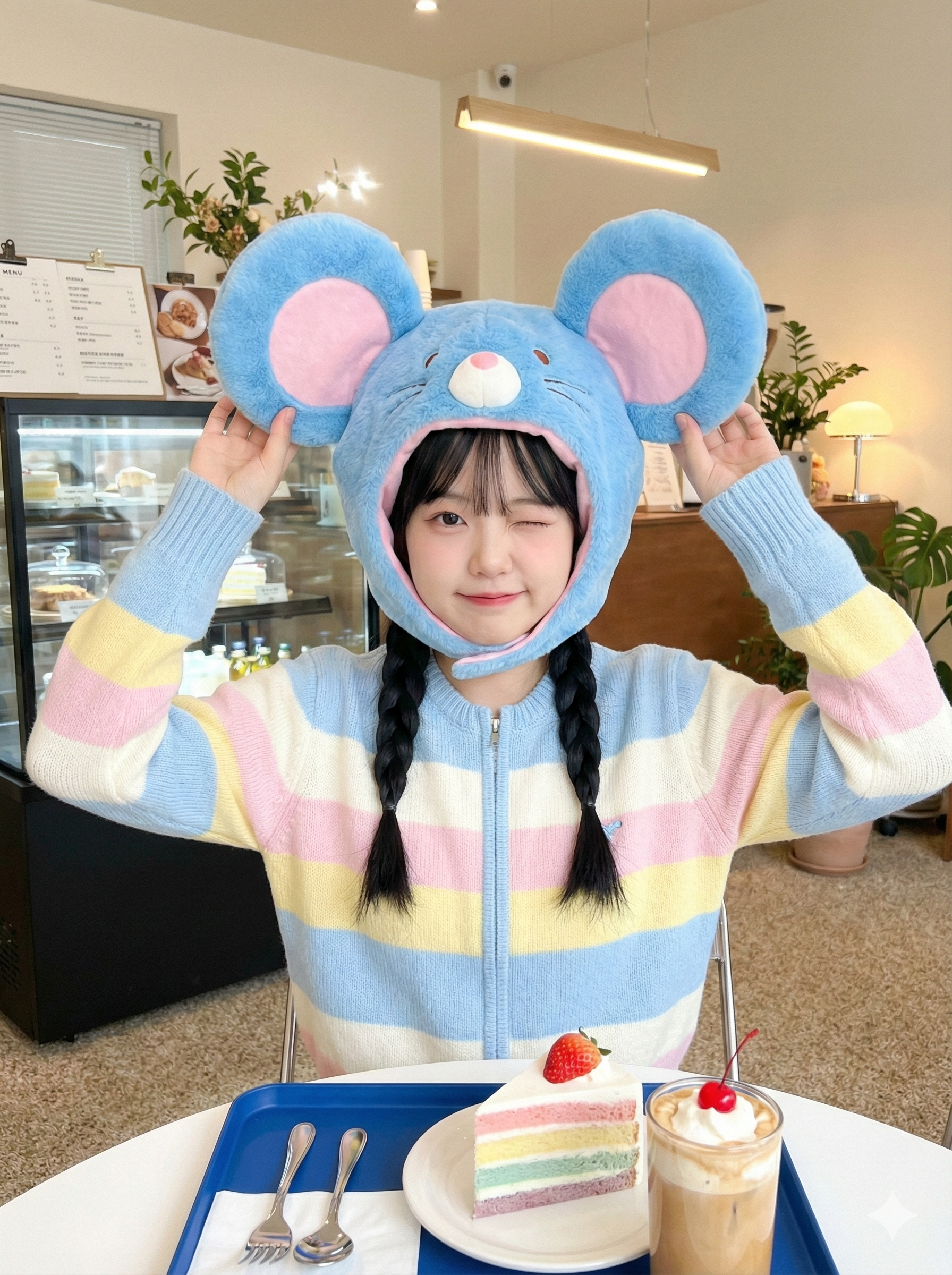 윙크하는 젊은 여성, 분홍색 귀가 달린 파란색 봉제 쥐 모자, 파스텔 줄무늬 가디건, 검은색 땋은 머리 두 가닥, 딸기가 올려진 무지개 케이크, 체리가 들어간 아이스 커피, 파란색 쟁반, 메뉴판과 진열장이 있는 카페 내부, 천장 바 조명.