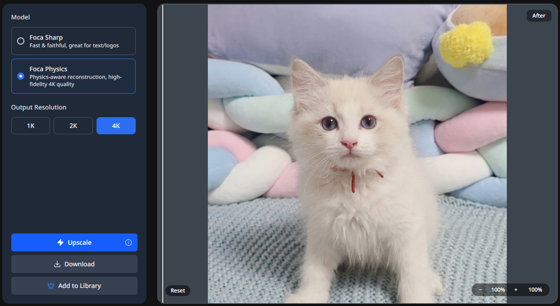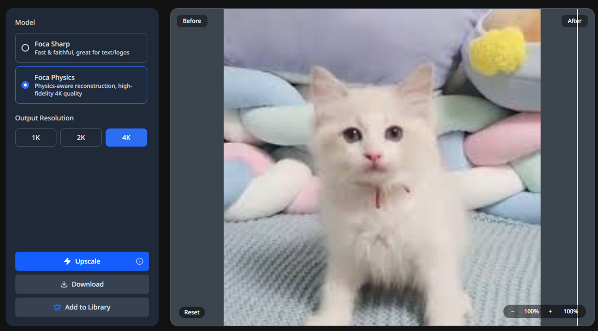 Foca Upscaler는 단순한 업스케일링 도구가 아닙니다. 업계에서는 이를 'Physics-aware AI(물리 기반 AI)'라고 부르는데요. 이는 AI가 이미지 속의 빛의 굴절, 표면의 질감, 그리고 재질의 특성을 마치 실제 물리 세계의 법칙처럼 이해하고 복원한다는 뜻입니다.