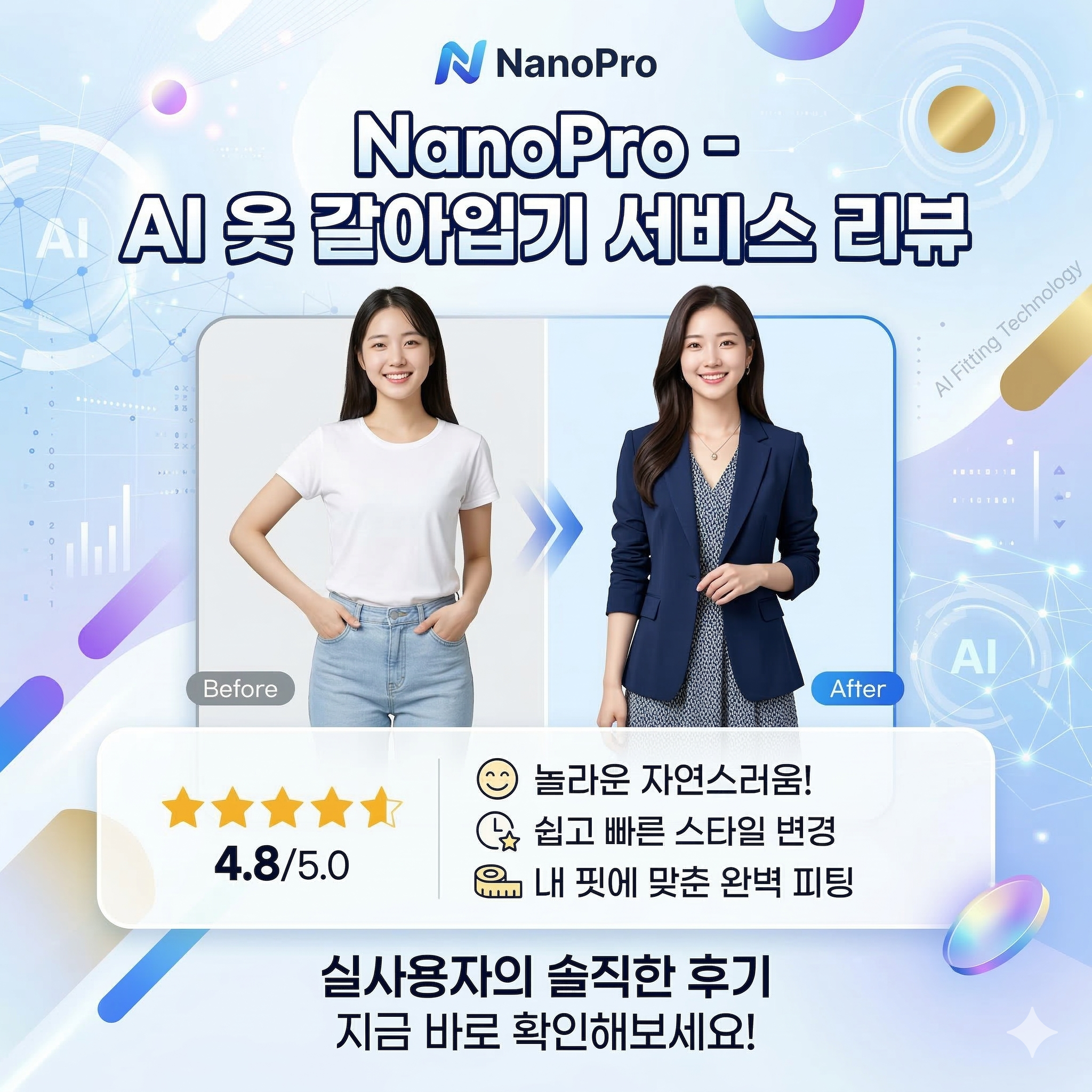 세상이 참 좋아졌다는 게 느껴지지 않나요? 이제 '이거 나한테 안 어울리면 어쩌지?'라는 고민 때문에 스트레스받지 마세요. NanoPro.ai가 여러분의 든든한 패션 도우미가 되어줄 거예요. 혹시 사용하시다가 궁금한 점이 생기면 언제든 댓글로 물어봐 주세요~ 우리 모두 실패 없는 쇼핑 성공해요! 😊