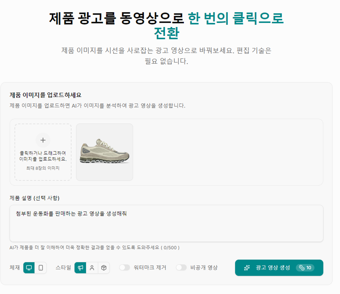 아래 혹시나 하는 마음에 운동화 사진 한장만 업로드하고 광고영상을 생성해 보았습니다. (무료 가능)