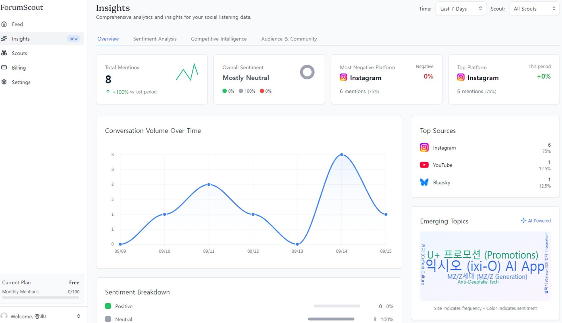 포럼스카우트는 레딧(Reddit), 트위터(X), 링크드인(LinkedIn), 유튜브, 인스타그램, 심지어 뉴스 사이트까지 다양한 플랫폼을 스캔해요. 무료 플랜만으로도 월 100건의 언급을 추적할 수 있으니 일단 한번 시작해 보는 걸 추천합니다!