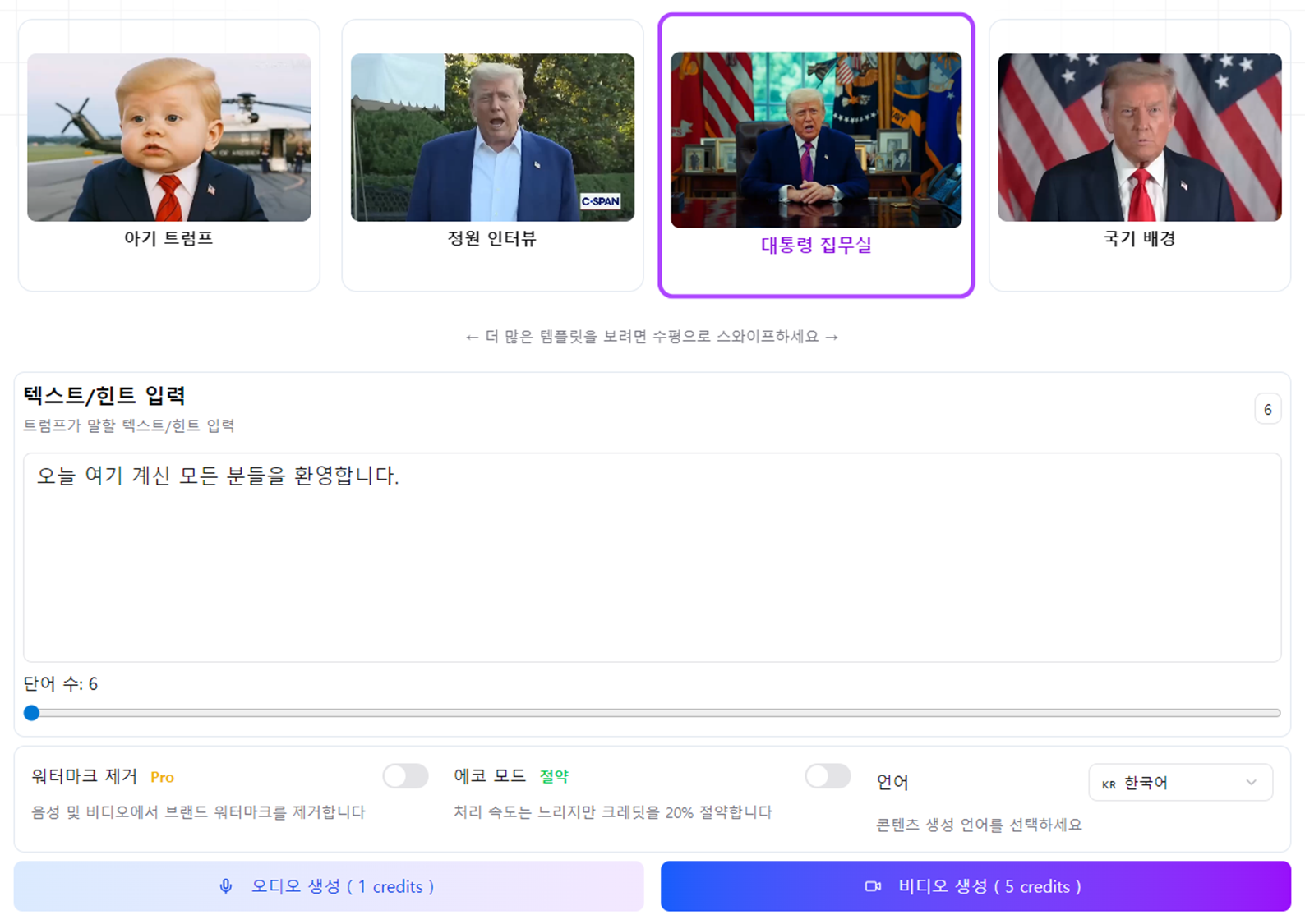 아래 상황 설정에서 "대통령 집무실"을 클릭하고 한글로 "오늘 여기 계신 모든 분들을 환영합니다."의 텍스트를 입력하고 비디오 생성을 눌렀습니다.