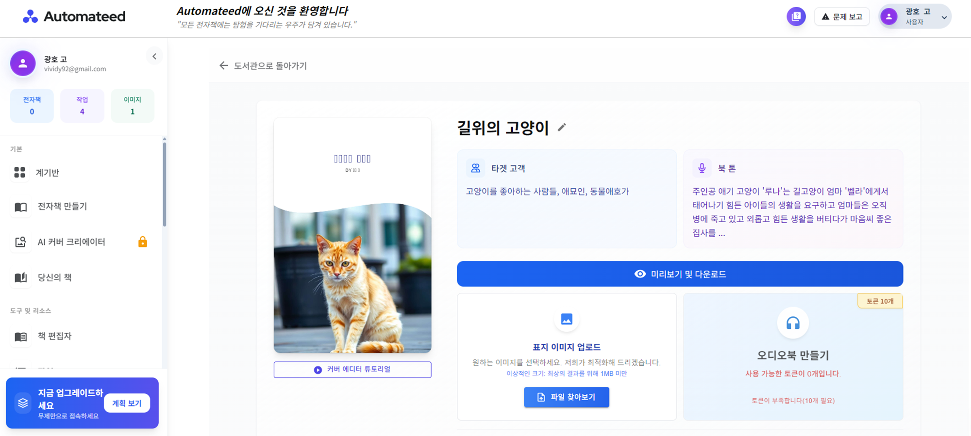 오토메이티드 웹페이지로 들어가서 무료회원 가입을 하시면, 1권의 전자책을 만들수 있는 기회를 주고 있습니다. 저는 '길위의 고양이'라는 제목으로 '어린 길고양이 노랑이' 이야기를 써 보았는데 간략한 줄거리만 적었는데도 삽화까지 제작을 해주었습니다.