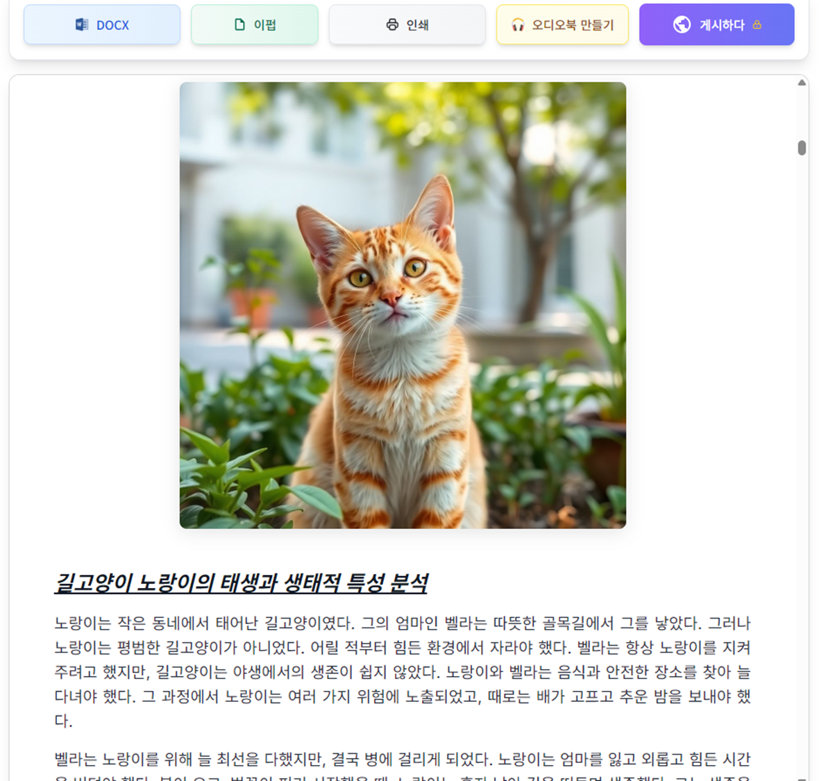 | AI 이미지 생성 | 표지 및 챕터 이미지를 AI로 제작 | 시각적 매력을 더해 책의 완성도 향상 |
