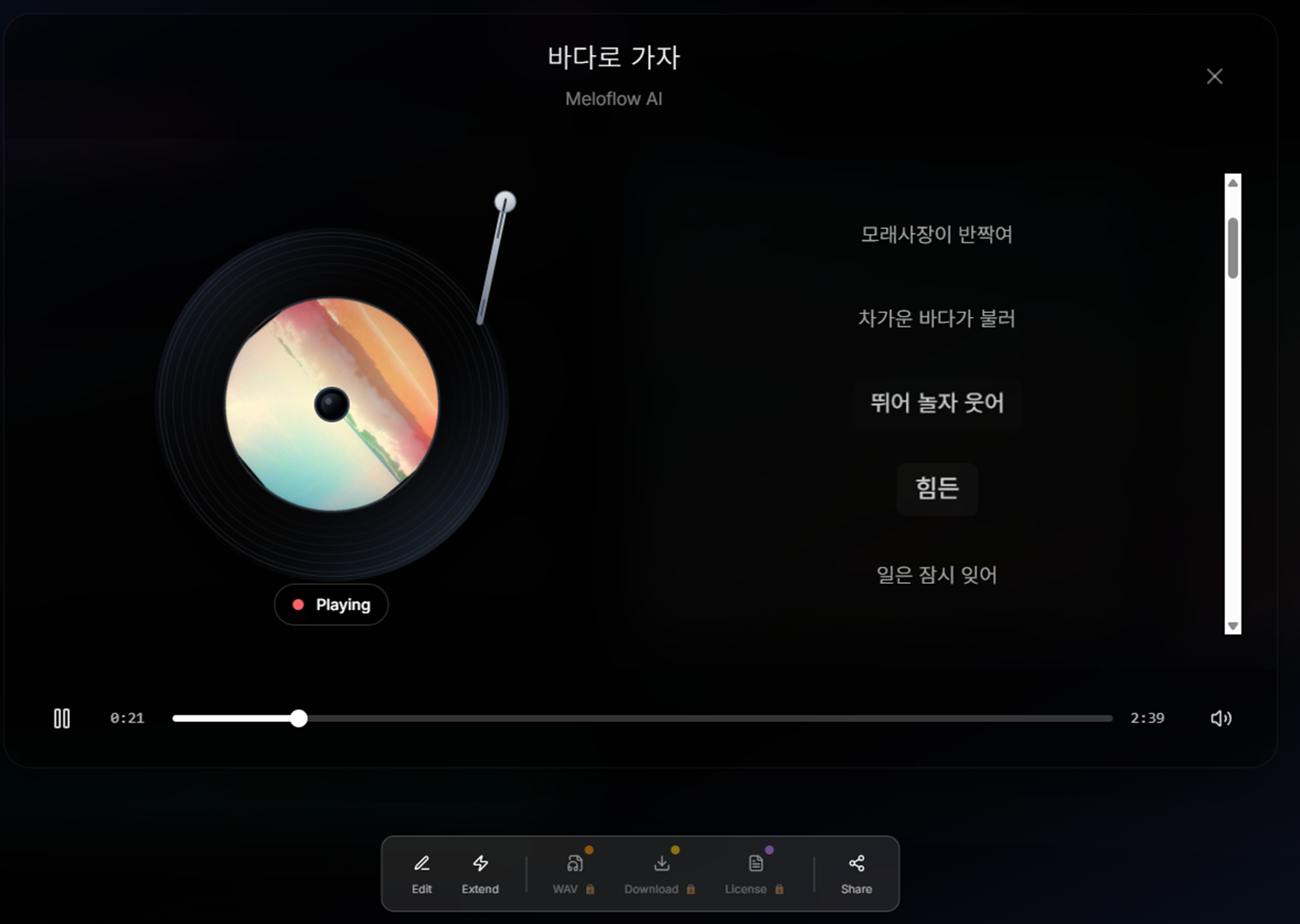 이렇게 입력하고 '생성' 버튼을 누르니, 몇 초 만에 근사한 음악이 뚝딱 만들어졌어요. 진짜 신기하더라고요.
