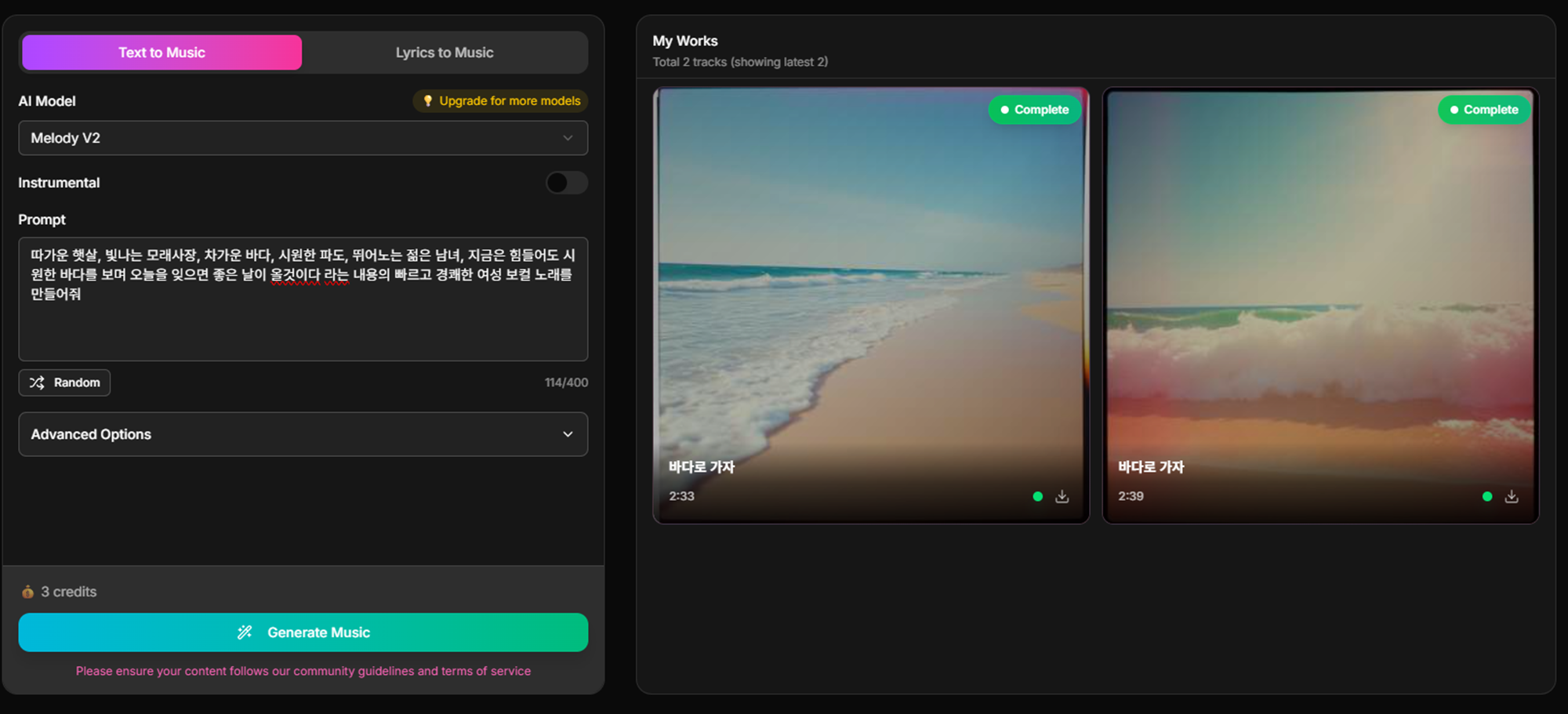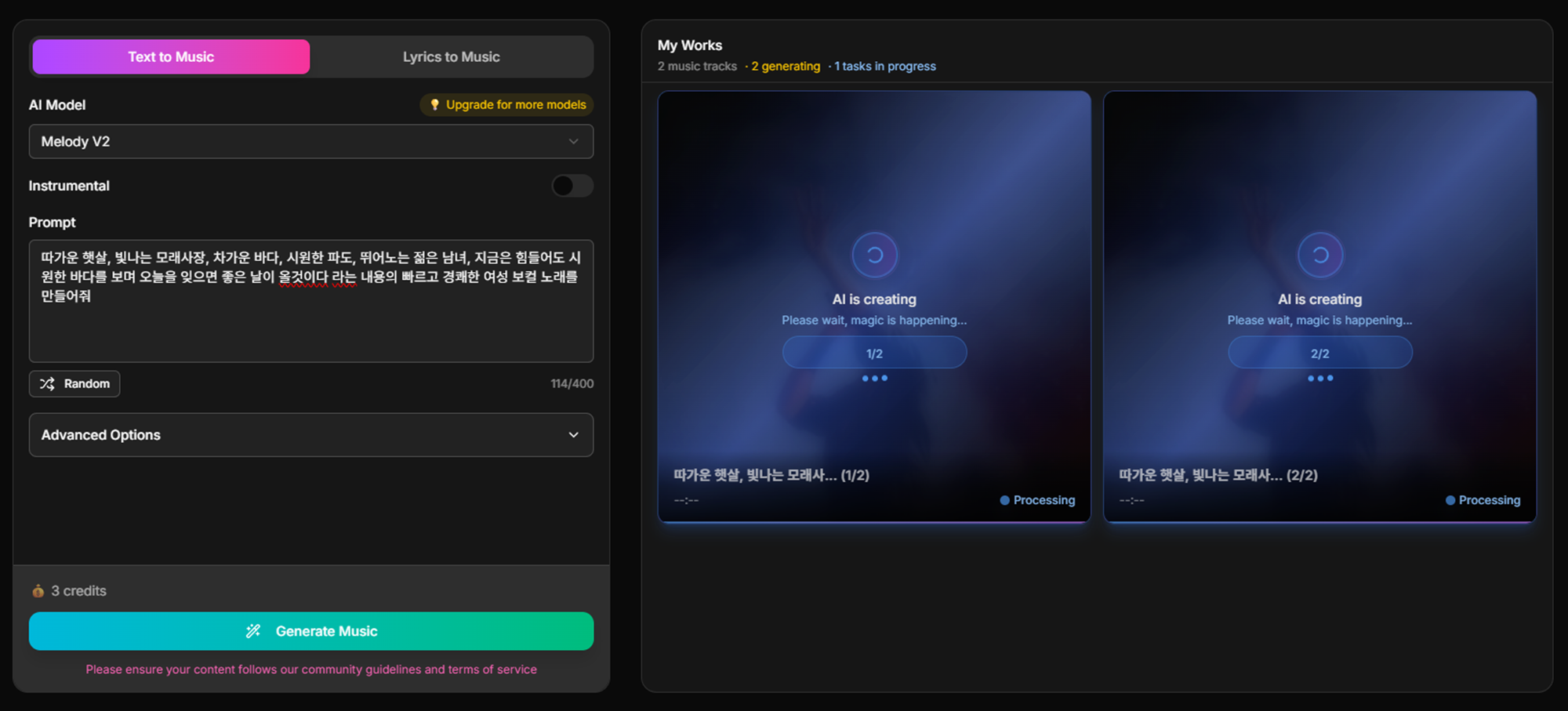 무료 회원가입을 한 후 노래를 만들 대략적인 분위기와 내용을 프럼프트로 입력하고 생성 버튼을 눌렀습니다.